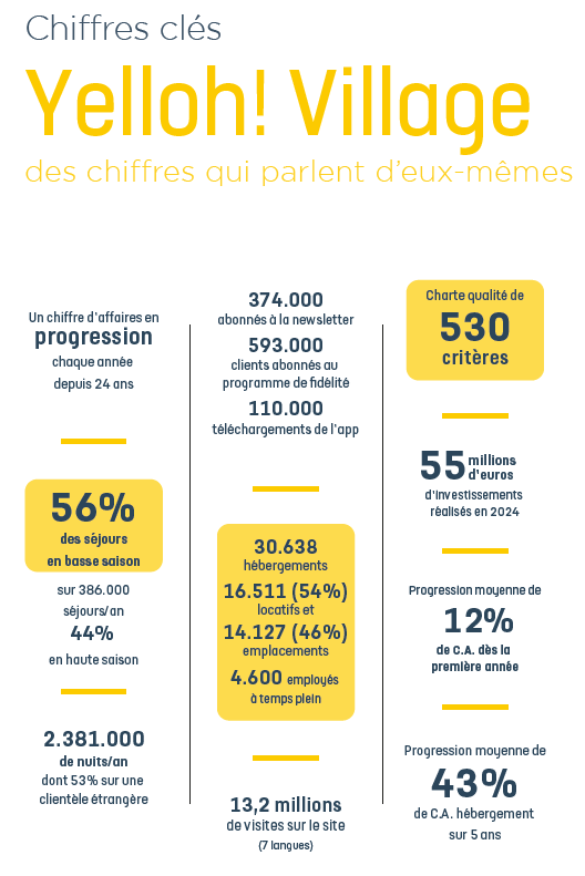 Marque de référence dans l’hôtellerie de plein air, Yelloh! Village regroupe 104 campings-villages implantés dans les plus beaux sites en France, en Espagne et au Portugal. Fonctionnant sous la forme d’une chaîne de franchisés qui rassemble les meilleurs professionnels du secteur, Yelloh! Village s’inscrit comme le premier réseau de campings-villages haut de gamme.